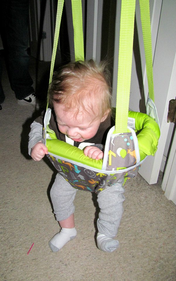 Playing in his Johnny Jump from my dad. He drenched the front in slober as soon as he got in it. It was fun to put it up on a higher setting & swing him back & forth between Adam & I. He is the kind of baby that likes all the things that a lot of babies would be scared of we have noticed.
